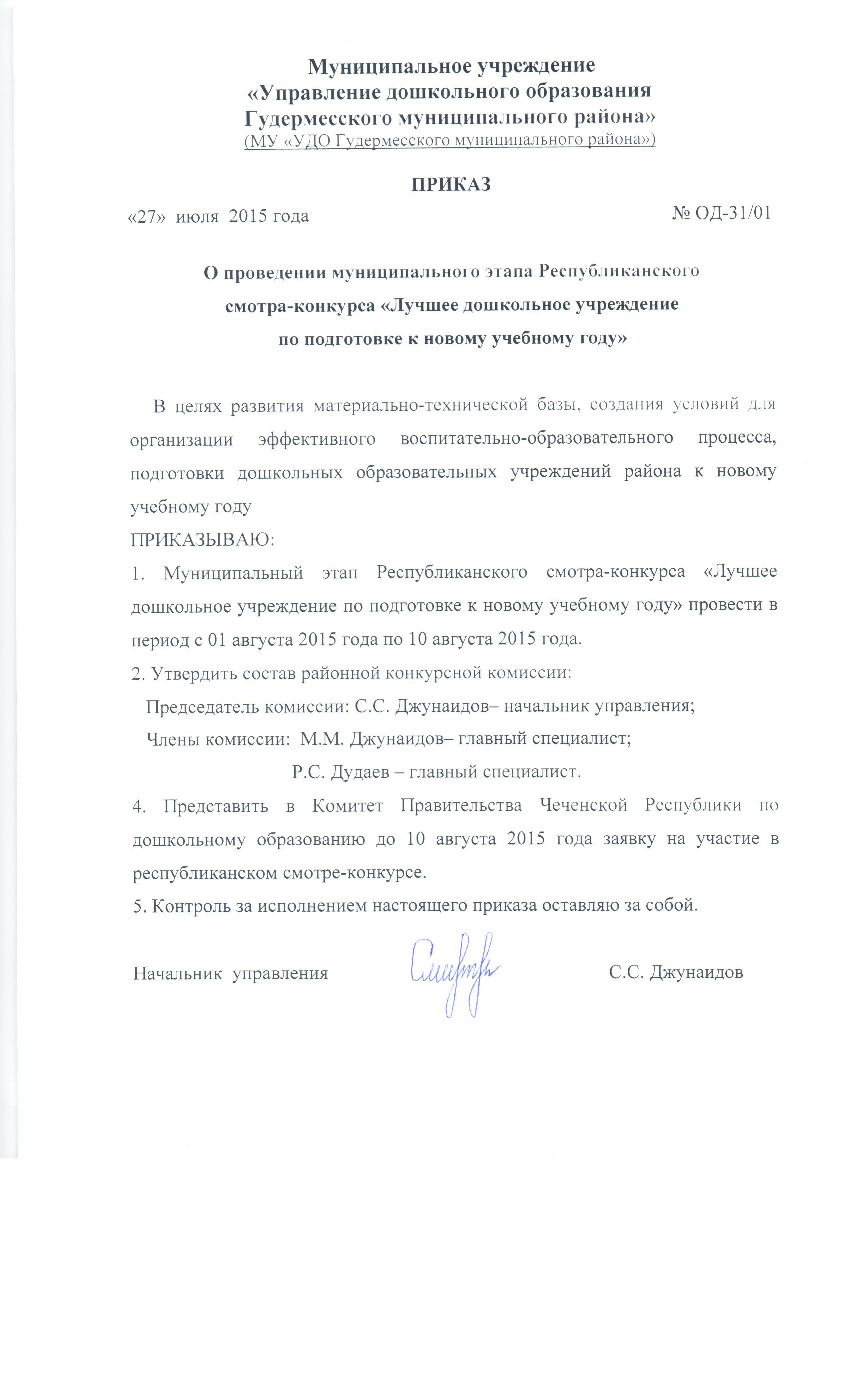 Приказ от 27.07.2015 г. № ОД-31/01 «О проведении муниципального этапа Республиканского смотра-конкурса «Лучшее дошкольное учреждение по подготовке к новому учебному году»