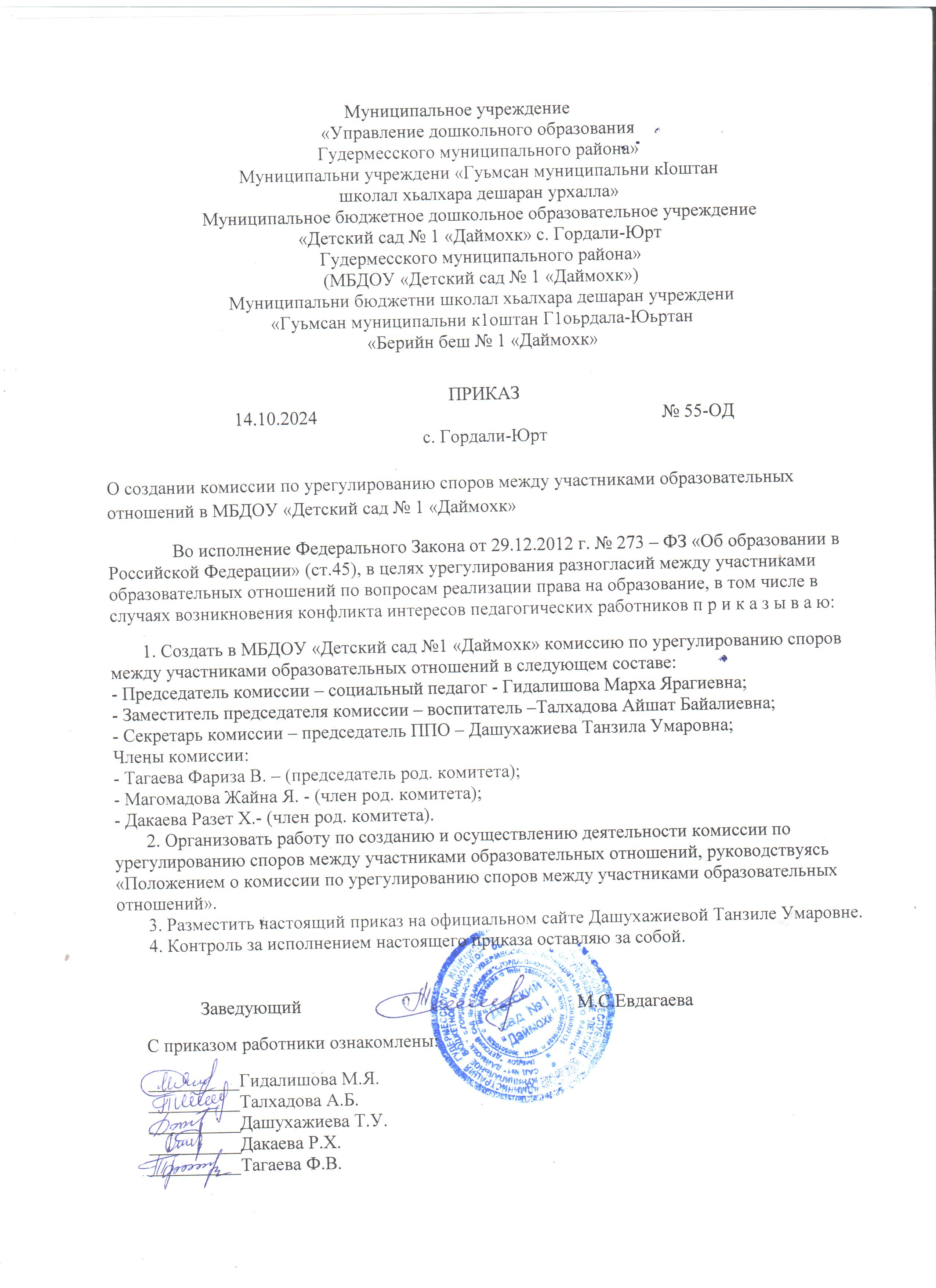 Коллективный договор Муниципального учреждения «Управление дошкольного образования Гудермесского муниципального района» на период с 19.09.2020 г. по 19.09.2023 г. (на три года)