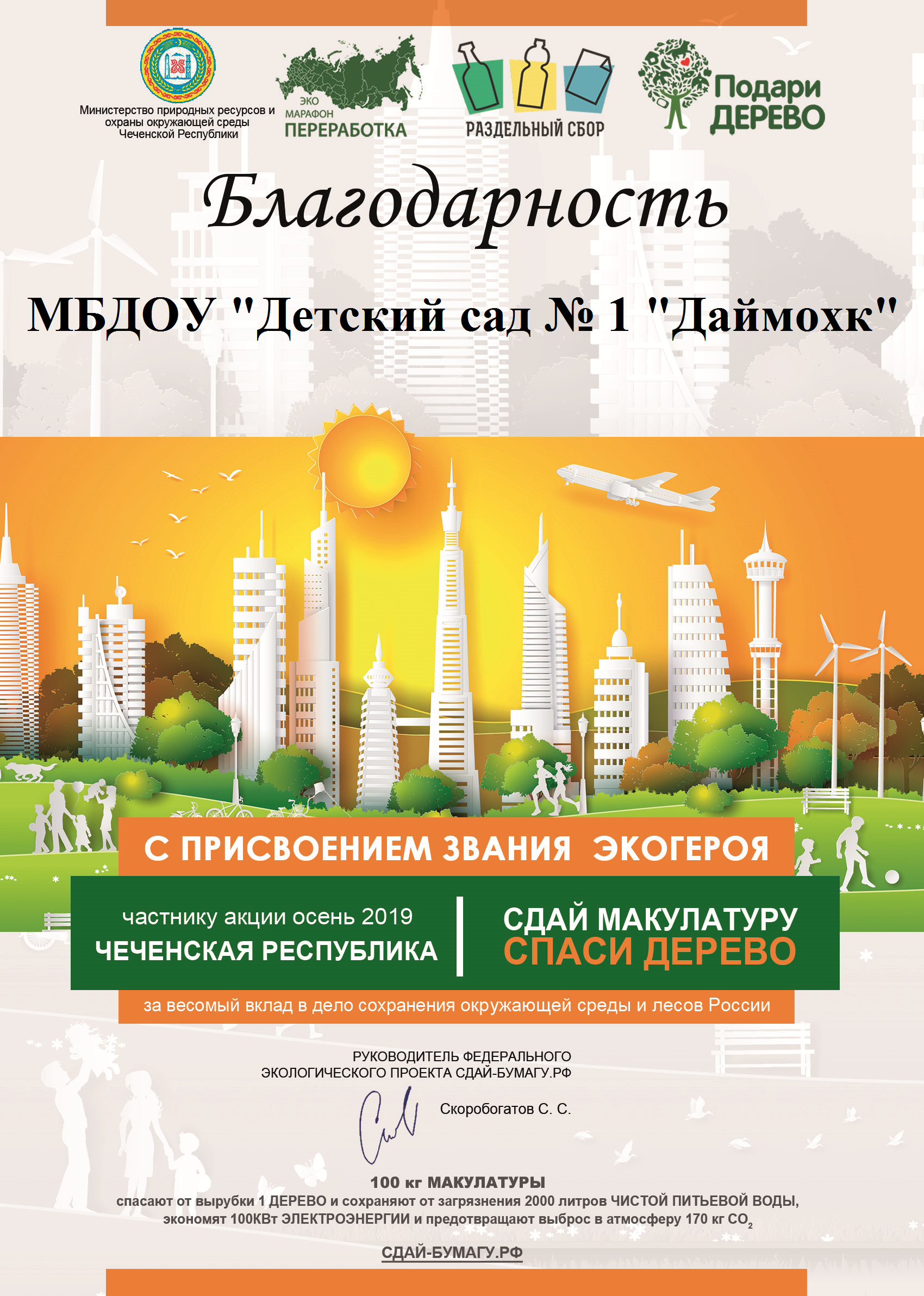 Наш коллектив получил благодарственное письмо, за активное участие в экологической акции "Сдай макулатуру-спаси дерево" в рамках Всероссийского эко-марафона "Переработка"