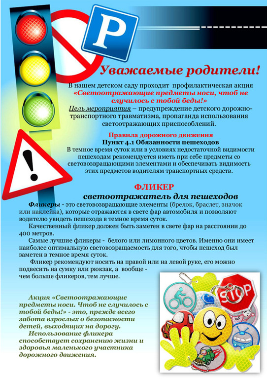 Уважаемые, родители! Светоотражающие элементы должны стать неотъемлемой частью детской одежды. Эта деталь теперь считается очень важной, и входит в дизайн моделей многих популярных марок. Очень актуально это для школьников, которые часто возвращаются домой из школы без сопровождения взрослых и иногда вынуждены переходить дорогу, но это пригодится для детей любого возраста. Присутствие светоотражающих элементов на детской одежде может значительно снизить детский травматизм на дорогах. Правила использования светоотражающих элементов, которые помогут взрослым и малышам быть заметными на дороге. Подвески (их должно быть несколько) лучше крепить за ремень, пояс, пуговицу, чтобы светоотражатели свисали на уровне бедра. Нарукавные повязки и браслеты закреплены так, чтобы они не были закрыты при движении и способствовали зрительному восприятию. Рекомендуется наносить их в виде горизонтальных и вертикальных полос на полочку, спинку, внешнюю часть рукавов, нижнюю наружную часть брюк, а также на головные уборы, рукавицы, обувь и другие предметы одежды. Значки могут располагаться на одежде в любом месте. Сумочку, портфель или рюкзак лучше держать в правой руке, а не за спиной. Эффективнее всего носить одежду с уже вшитыми светоотражающими элементами. В городе при пересечении проезжей части в темноте рекомендуется иметь светоотражатели справа и слева. По статистике дорожно-транспортных происшествий в РФ из года в год на дорогах страны гибнет от 30 до 35 тысяч чел. и 270-280 тыс. человек получают ранения разной степени тяжести. Значительная часть пострадавших – пешеходы. Почти 90% наездов на пешеходов приходится на темное время суток. Это как раз то время, когда дети идут в школу, в детский садик, а взрослые идут на работу, учебу или возвращаются домой. Доказано, что в темное время суток человеческий глаз способен воспринимать только 5% той информации, которую он видит при дневном свете, поэтому идущего или стоящего на обочине пешехода — маленькую темную фигурку, сливающуюся с окружающей средой, водитель очень часто просто не видит! Или замечает в самый последний момент, когда практически не остается времени, чтобы успеть правильно среагировать... Снег, туман, дождь, тени от деревьев и кустов делают пешехода мало заметным, даже на освещенной дороге. К тому же пешеход, видя огни приближающегося автомобиля, предполагает, что водитель его тоже видит. Особенно беспечны дети и подростки, рискованно переходящие улицу.