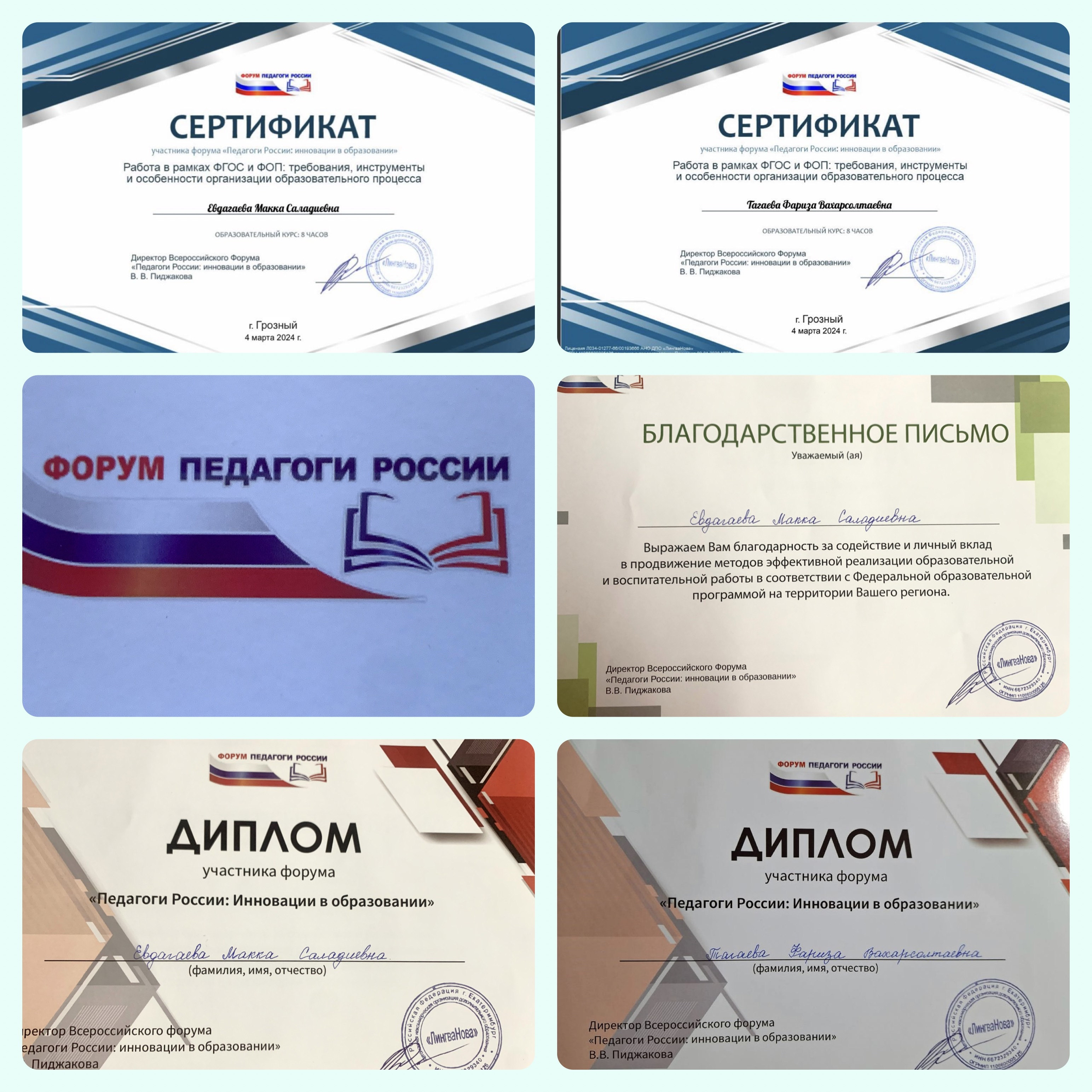 На форуме приняли активное участие наши педагоги. В рамках работы форума они посетили лекции, тренинги, мастер классы. Им были вручены сертификаты, дипломы, а так же благодарственное письмо за содействие и личный вклад в продвижение методов эффективной реализации образовательной и воспитательной работы в соответствии с ФОП.