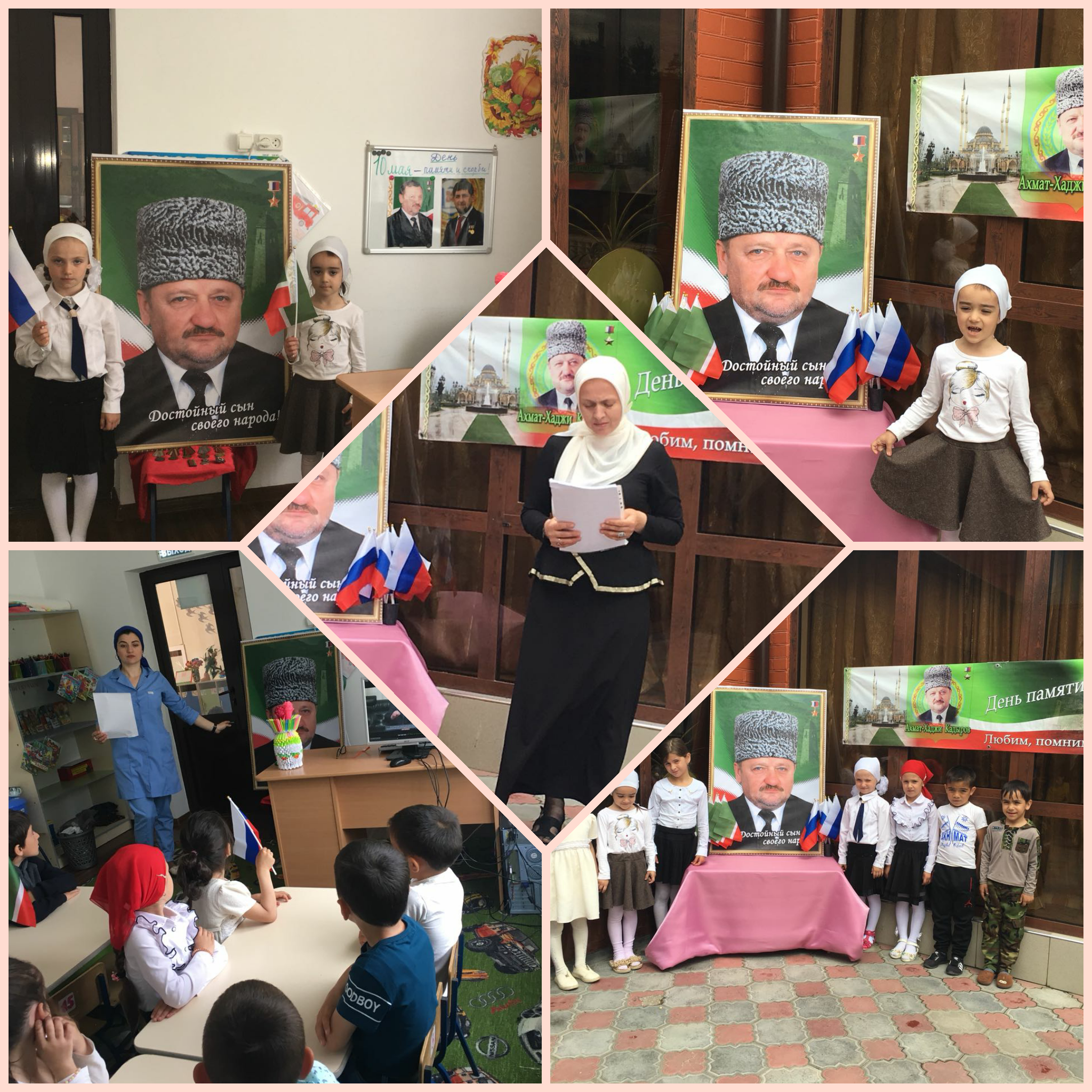 Фасад зданий тематически оформлен баннером «Любим, помним и ценим…». В ДОУ во всех возрастных группах проведены беседы: «День памяти и скорби», «Жизнь, отданная во имя жизни». В День памяти и скорби Чеченской Республики – 10 мая необходимо отдать дань уважения и памяти Ахмат-Хаджи Кадырову, выразив ему человеческую признательность. Дала г1азот къобал дойла цуьна! Он много значил для всего чеченского народа. Являлся символом Мира и Процветания нашей республики, олицетворением надежды на лучшее будущее. Он всегда говорил, что гордится своим народом. Народ отвечал ему взаимностью. Мы гордились при жизни А.А. Кадыровым, гордимся им и после его смерти. Он ушел непобежденным!
